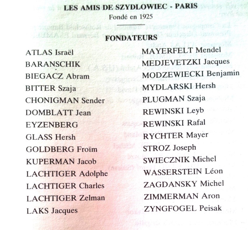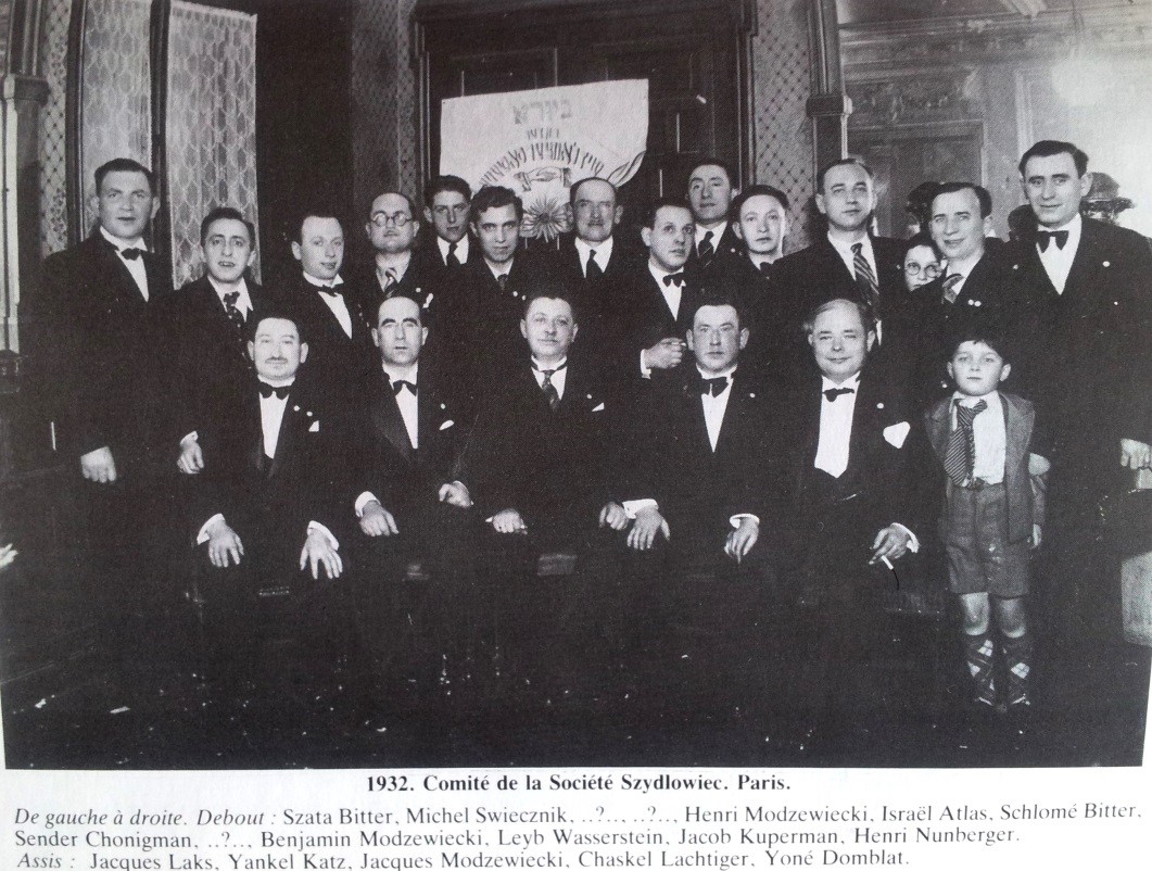 Le texte qui suit est une ébauche le l’histoire de la société parisienne de Szydlowiec car il y en a eu d’autres au XXe siècle dans d’autres pays. Selon plusieurs sources, la société française a été créée en 1925. En tout cas c’est ce qui était écrit sur la bannière qui est malheureusement introuvable pour le moment. Plusieurs membres de la société ont revendiqué avoir été l’initiateur, mais pour faire une société il fallait être plusieurs et nous reprenons ici, la liste des fondateurs qui apparait dans le Yiskor bir en français (La Mémoire de Szydlowiec). |