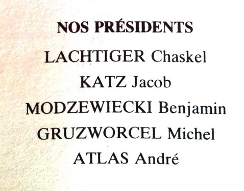 Mais il y a aussi la nécessité d’aider les nouveaux arrivants. En effet, en Pologne, l’antisémitisme progresse très vite après 1934 et la mort du président Pilsudski. Le boycott des activités juives entraine un chômage spécifique et pousse les jeunes à s’expatrier alors même que les frontières se ferment. Certains tentent l’Amérique du Sud, mais la plupart choisissent le France, le pays de la liberté, de Victor Hugo, le pays qui aura su vaincre ses démons et réhabiliter le Capitaine Dreyfus. Avant-guerre, selon le Yiskor Bir, c’est Chaskel LACHTIGER qui présidait la société. |