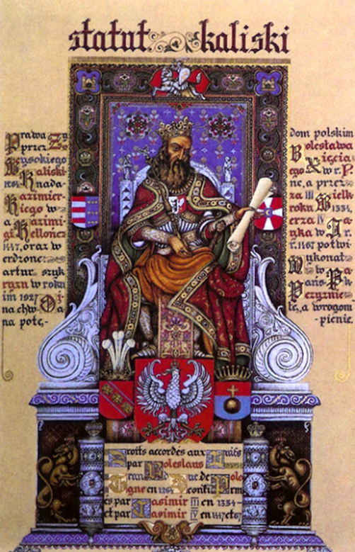 En 1264, Boleslas le Pieux proclame la Charte de Kalisz - accordant des libertés aux Juifs de Pologne. Au XIVe siècle, persécutés en Europe occidentale, les Juifs sont invités à venir en Pologne par le roi Casimir III, surtout après l'expulsion massive des Juifs d’Angleterre, de France, d’Allemagne et d’Espagne. Sous la dynastie Jagellone la Pologne devient le territoire de la plus grande communauté juive d'Europe. Les édits royaux leur garantissent la sécurité et la liberté de culte alors que pendant la peste noire l'Europe occidentale est le théâtre de persécutions, les juifs étant accusés d‘en être la cause. La plus grande partie de la Pologne fut épargnée par le fléau, alors que l'immigration juive fournissait une main d'œuvre nombreuse et qualifiée à cet Etat naissant. |
